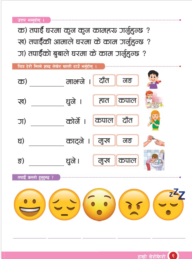- म र मेरो परिवार: तपाईंको परिवारका सदस्यहरूको परिचय गराइएको छ। आमा, बुवा, भाइ, दिदी जस्ता सदस्यहरूको भूमिका र बारेमा जानकारी प्राप्त गर्नुहोस्।