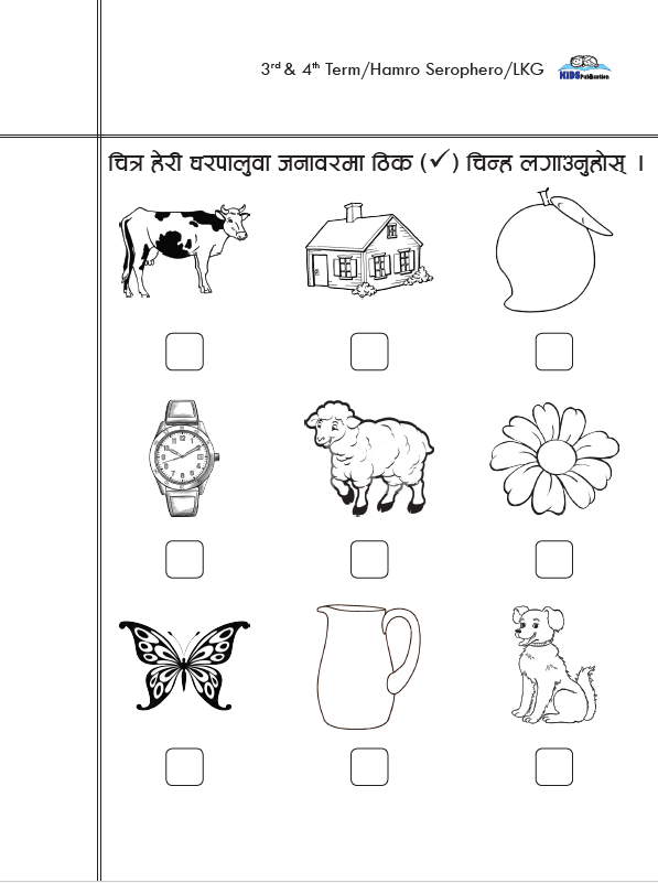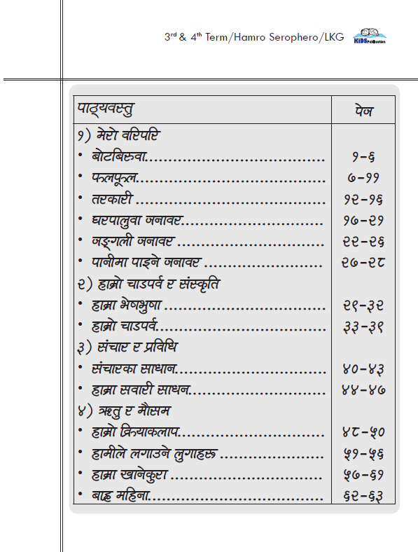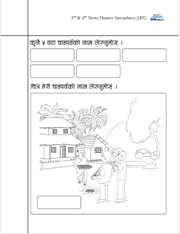 The homework copy designed for LKF students, specifically those in their 3rd or 4th term. It appears to be part of the “Hamro Serophero” curriculum, which likely focuses on early childhood education in Nepal.